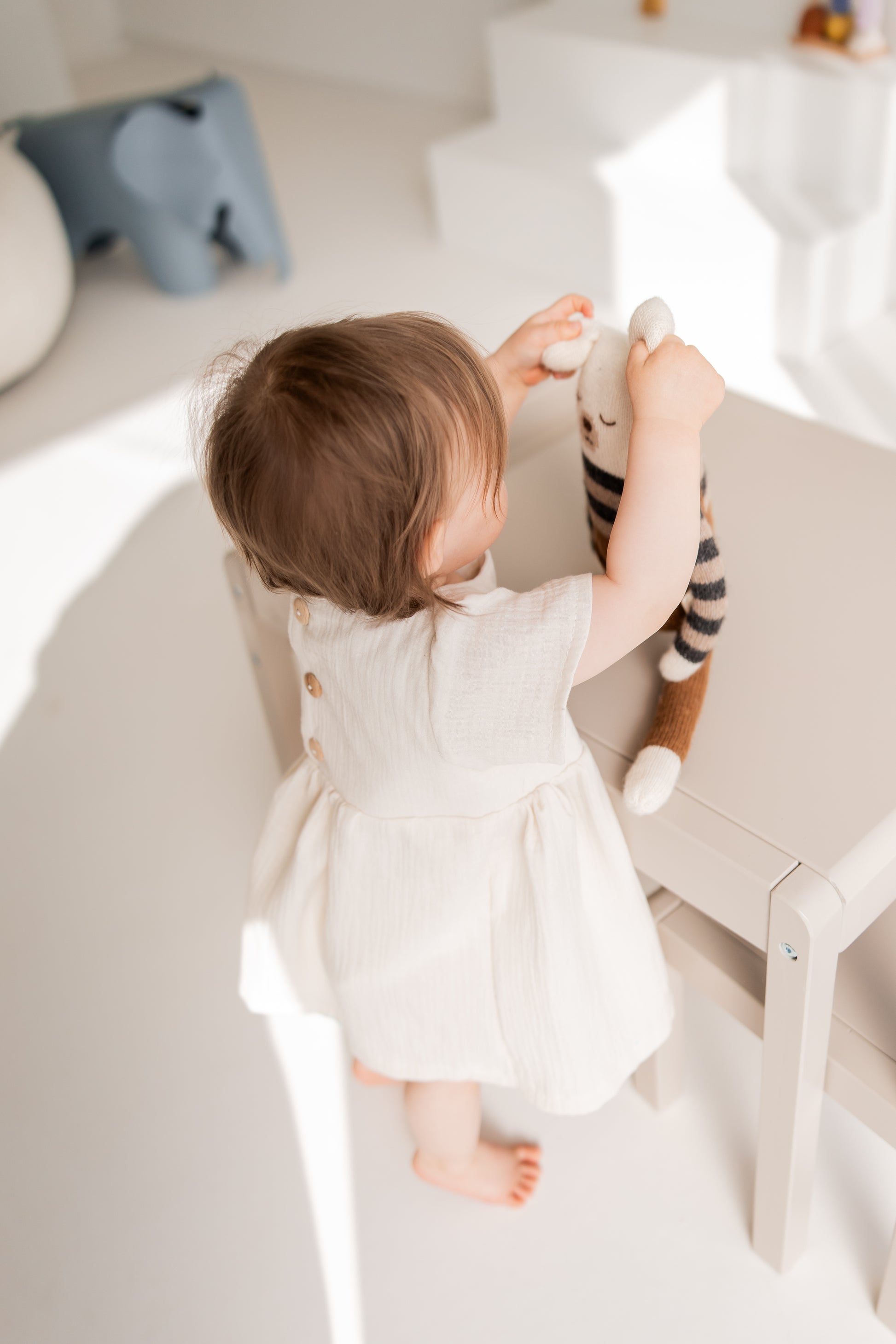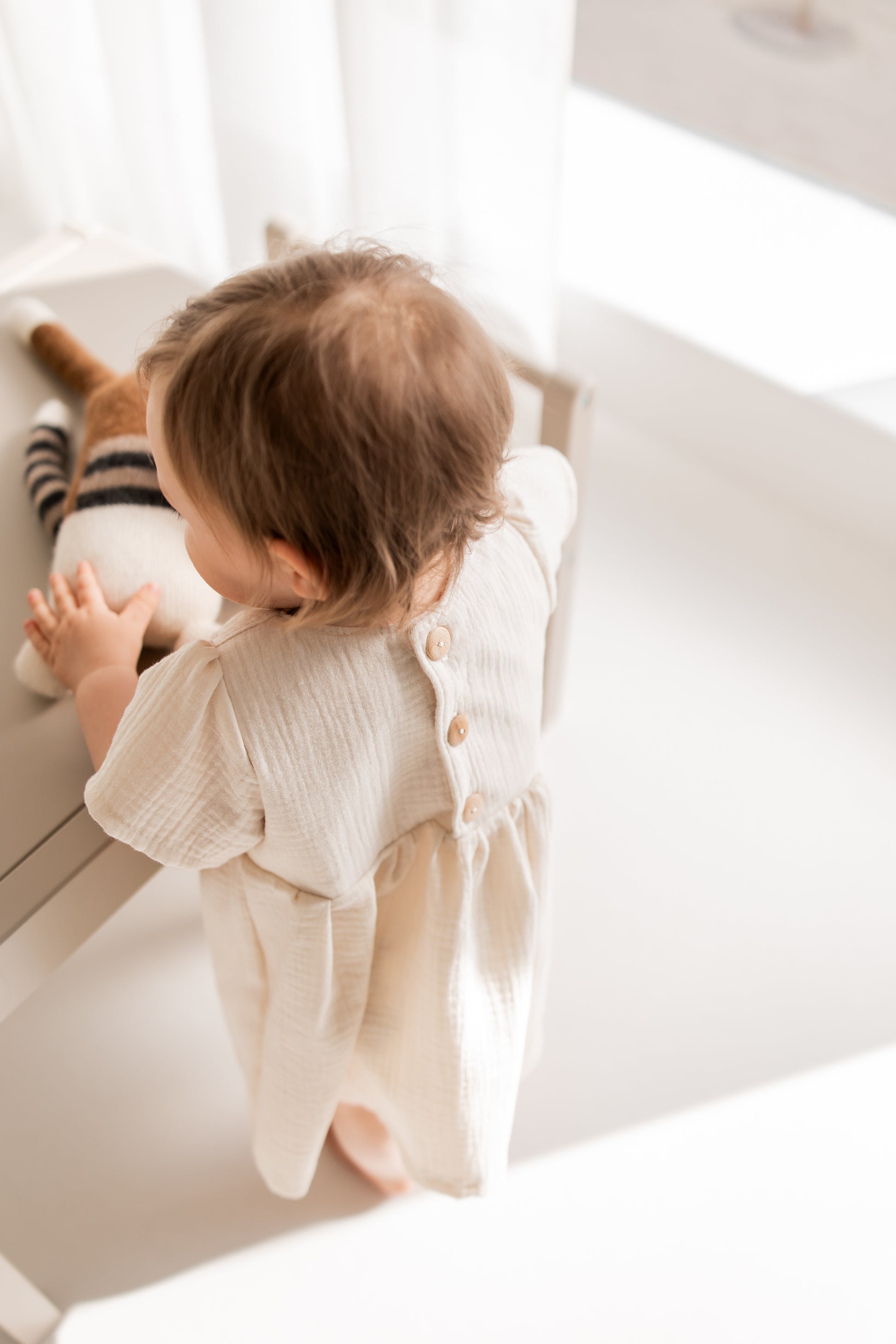 Die Knopfleiste am Rücken mit hübschen Naturholzknöpfen macht das An- und Ausziehen kinderleicht – und verleiht dem Kleid gleichzeitig einen liebevollen, detailverliebten Look.
