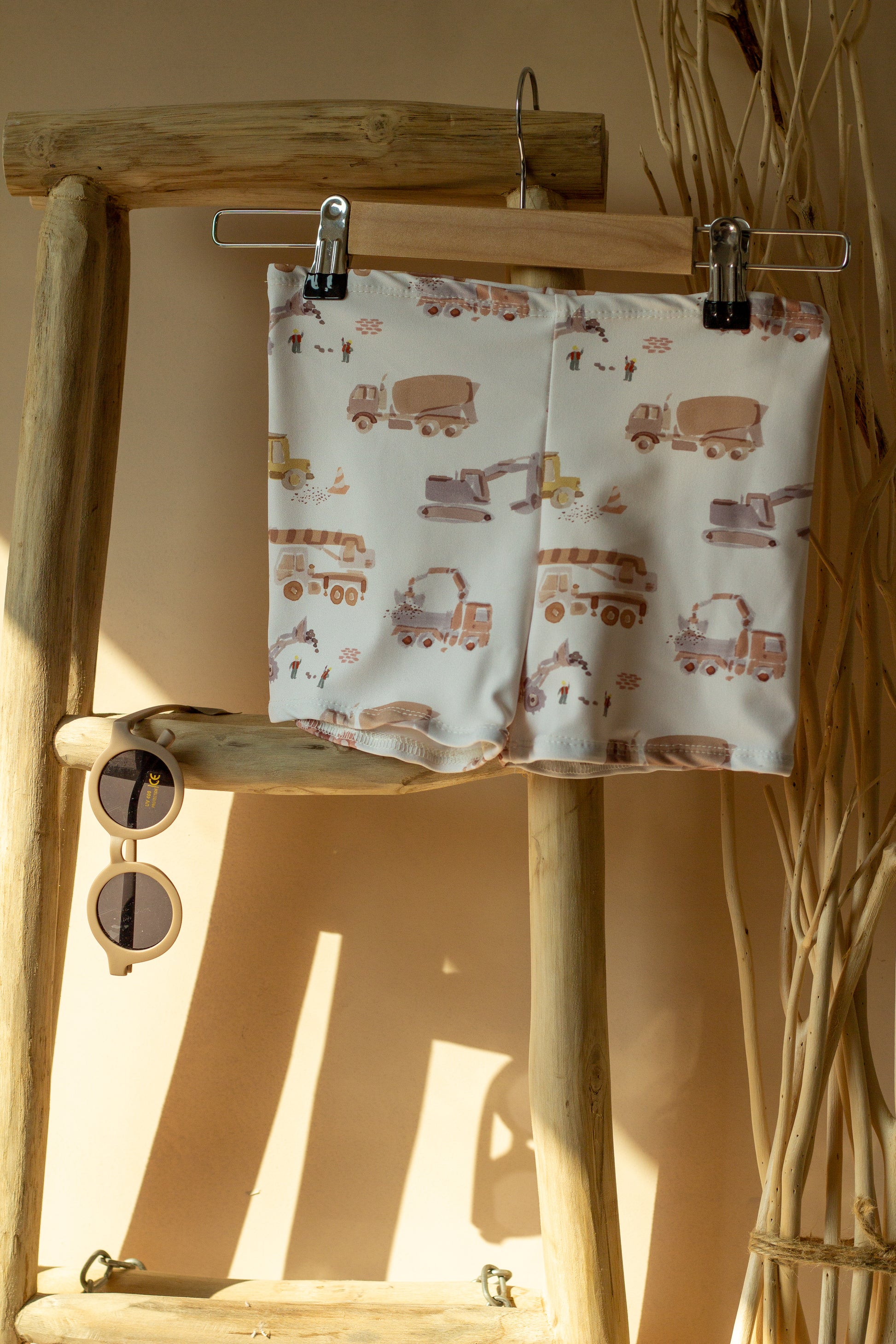 Schöne schlichte Badehose mit Baufahrzeugen im Watercolor-Design.