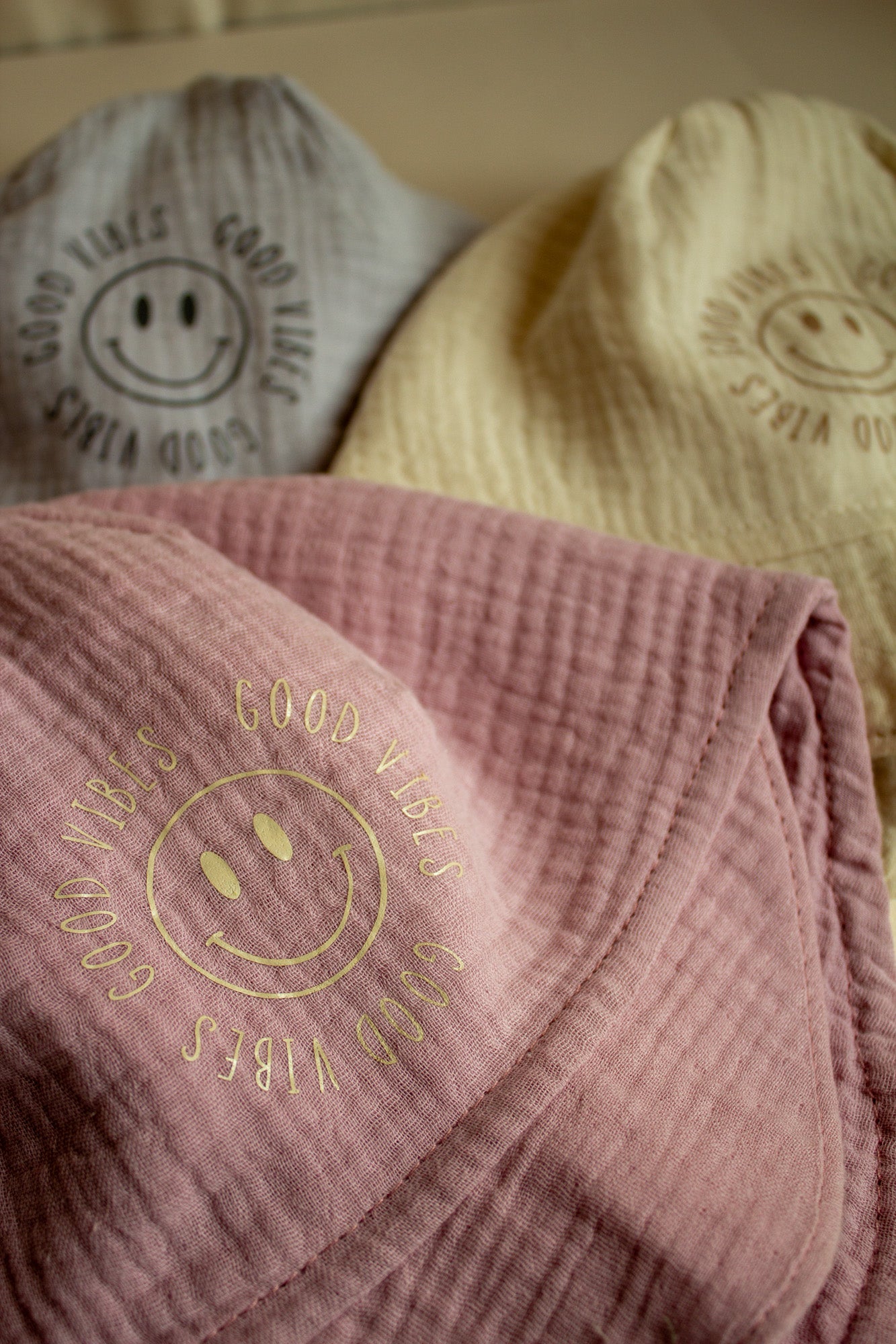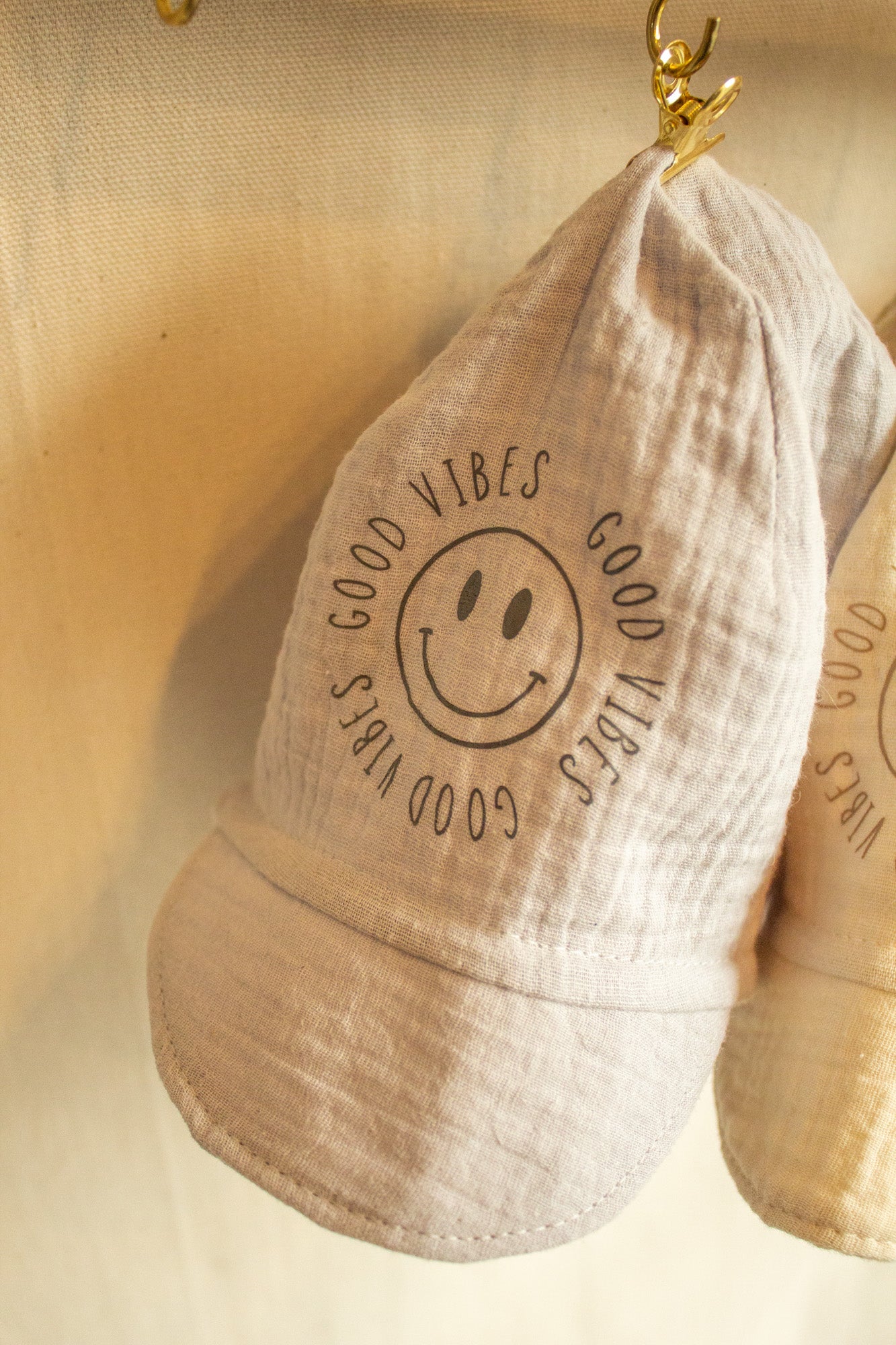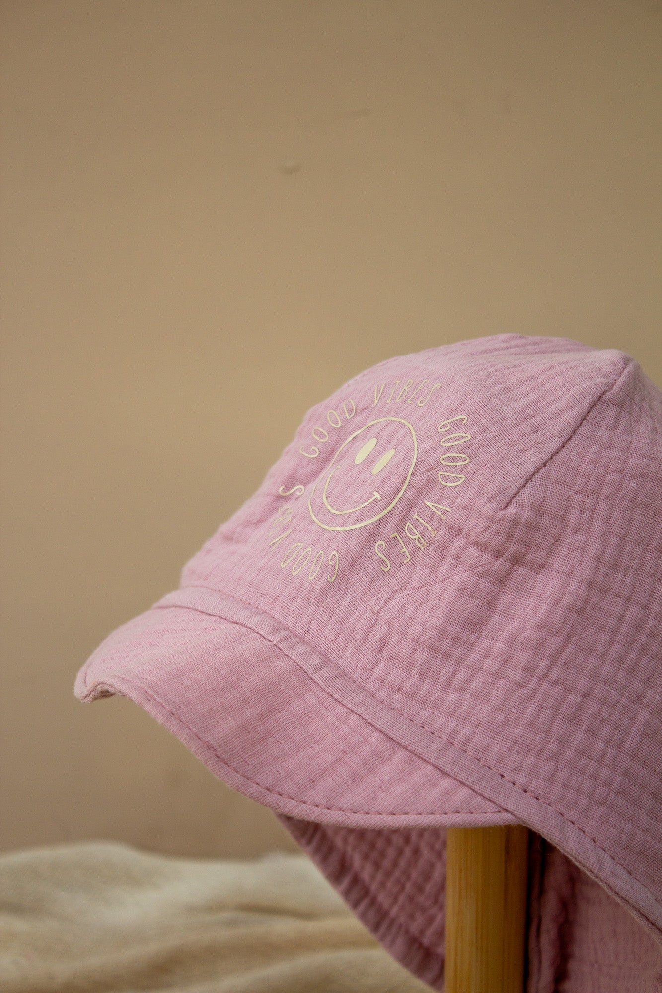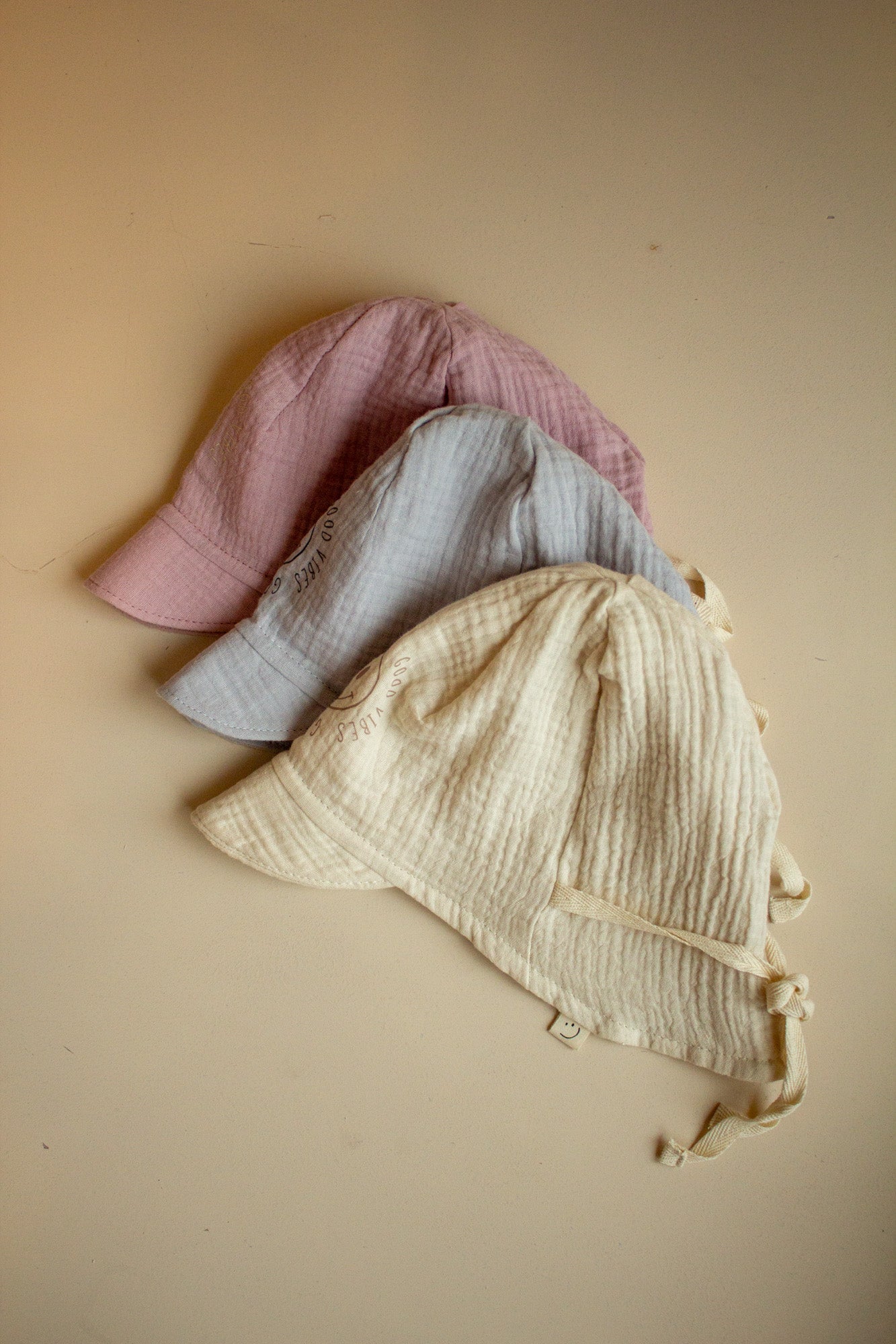 Sommermütze mit Nackenschutz aus Musselin mit Aufdruck
